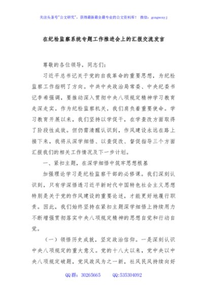 / 在纪检监察系统专题工作推进会上的汇报交流发言
