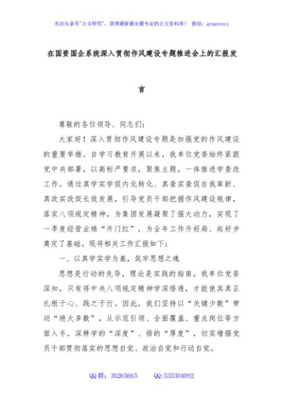 / 在国资国企系统深入贯彻作风建设专题推进会上的汇报发言