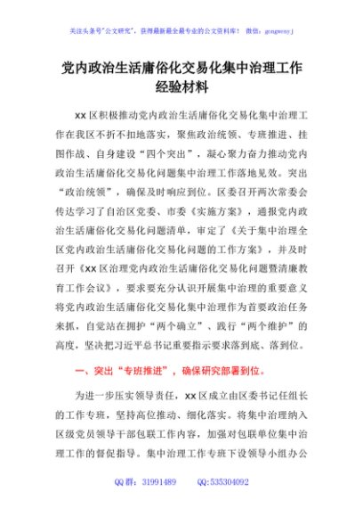 / 党内政治生活庸俗化交易化集中治理工作经验材料