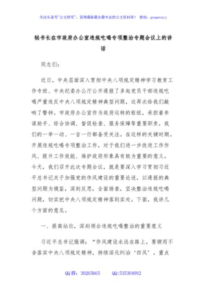 / 秘书长在市政府办公室违规吃喝专项整治专题会议上的讲话