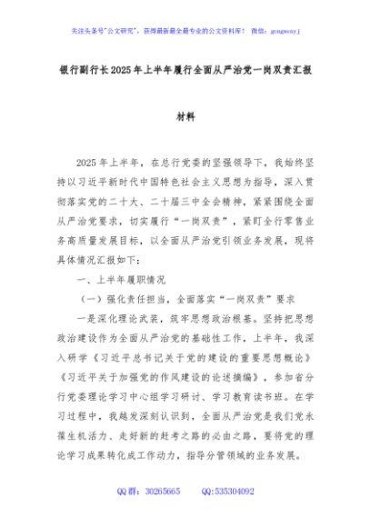 / 银行副行长2025年上半年履行全面从严治党一岗双责汇报材料