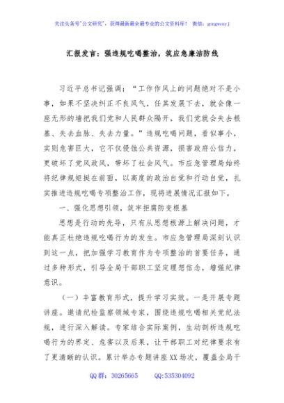 / 汇报发言:强违规吃喝整治,筑应急廉洁防线