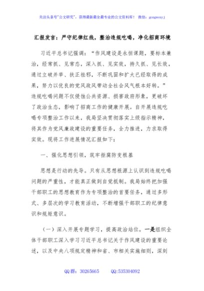 / 汇报发言:严守纪律红线,整治违规吃喝,净化招商环境