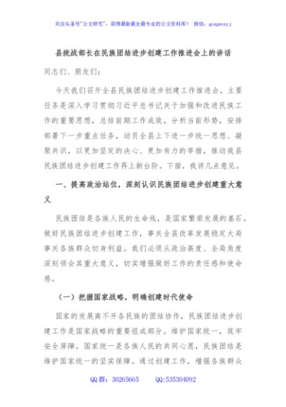 / 县统战部长在民族团结进步创建工作推进会上的讲话