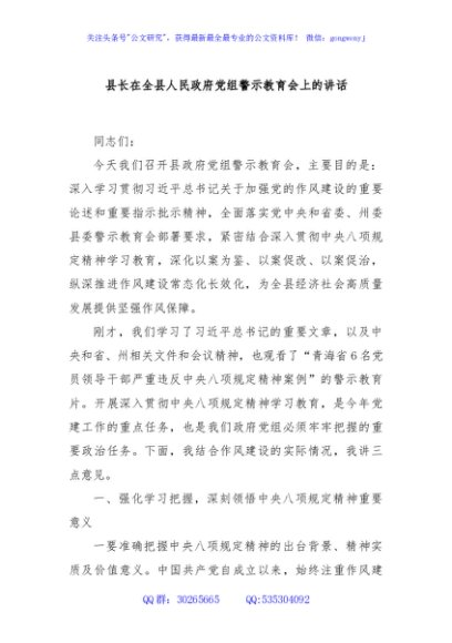 / 县长在全县人民政府党组警示教育会上的讲话