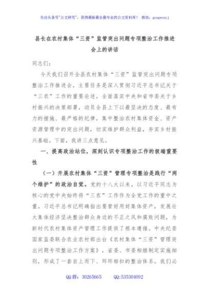 / 县长在农村集体“三资”监管突出问题专项整治工作推进会上的讲话