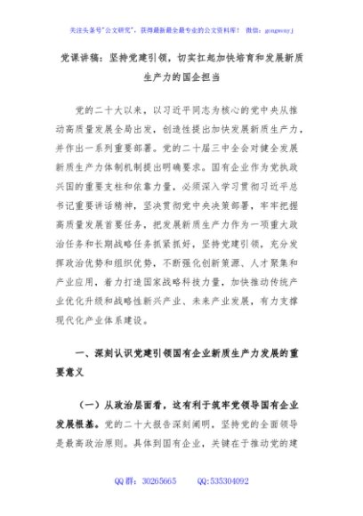 / 党课讲稿:坚持党建引领,切实扛起加快培育和发展新质生产力的国企担当