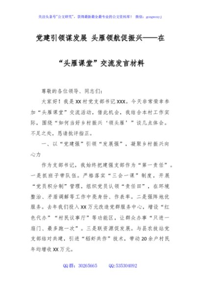 / 党建引领谋发展 头雁领航促振兴——在“头雁课堂”交流发言材料