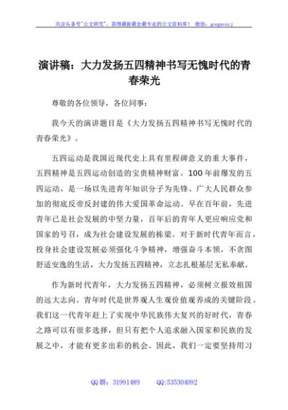 / 演讲稿:大力发扬五四精神 书写无愧时代的青春荣光