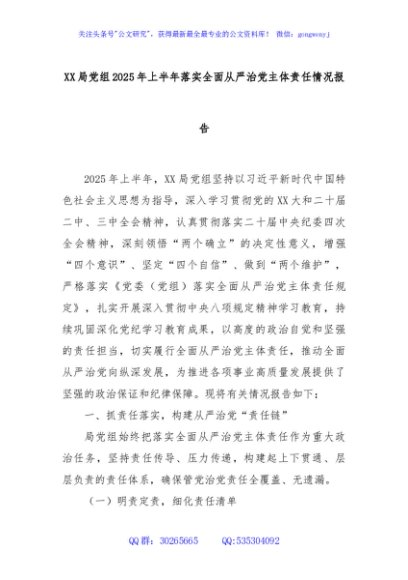 / XX局党组2025年上半年落实全面从严治党主体责任情况报告