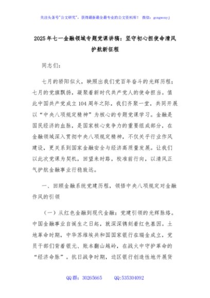 / 2025年七一金融领域专题党课讲稿:坚守初心担使命清风护航新征程