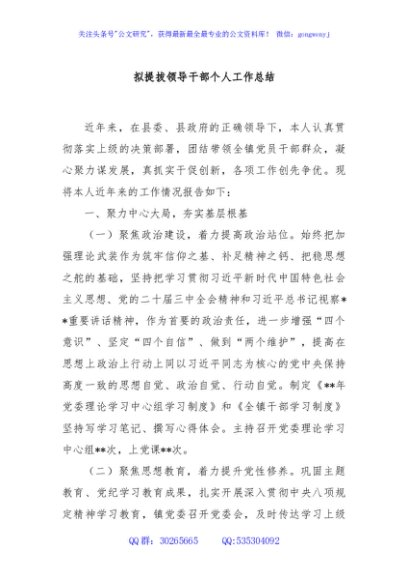 拟提拔领导干部个人工作总结