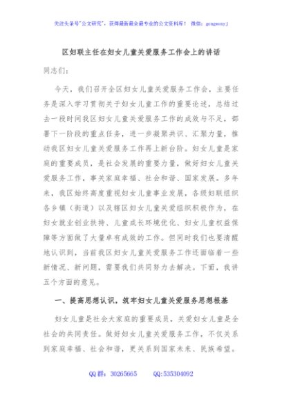 / 区妇联主任在妇女儿童关爱服务工作会上的讲话