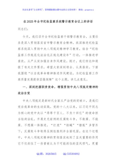 / 在2025年全市纪检监察系统警示教育会议上的讲话