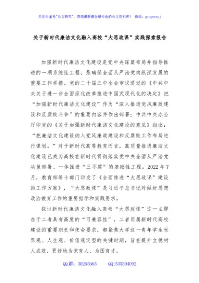 / 关于新时代廉洁文化融入高校“大思政课”实践探索报告