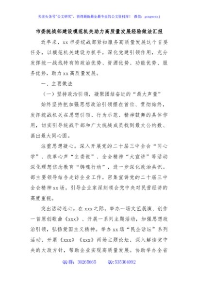 / 市委统战部建设模范机关助力高质量发展经验做法汇报
