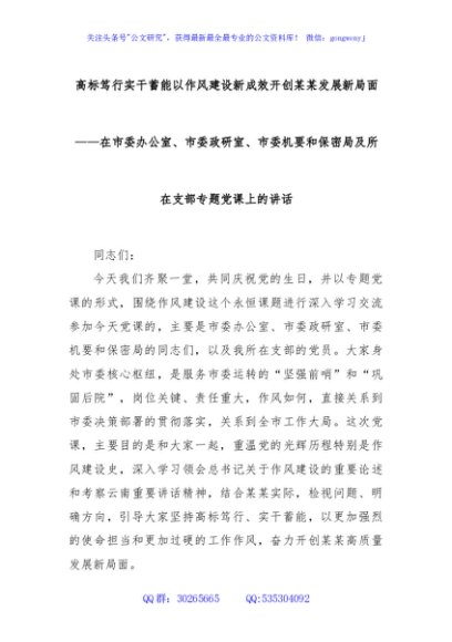 高标笃行实干蓄能以作风建设新成效开创某某发展新局面——在市委办公室、市委政研室、市委机要和保密局及所在支部专题党课上的讲话