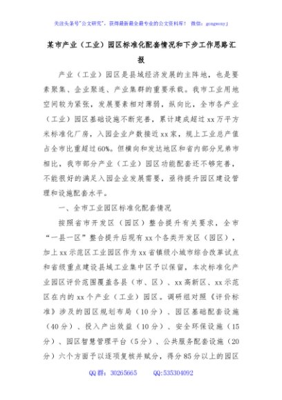 / 某市产业(工业)园区标准化配套情况和下步工作思路汇报