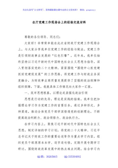 / 在厅党建工作现场会上的经验交流材料