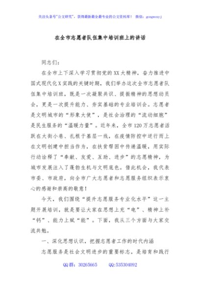 / 在全市志愿者队伍集中培训班上的讲话