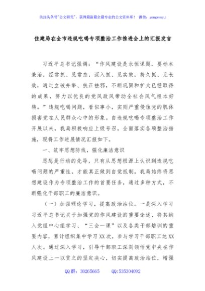 / 住建局在全市违规吃喝专项整治工作推进会上的汇报发言