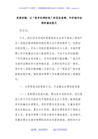 / 党课讲稿:以“筑牢纪律防线”的坚实盾牌,守护城市治理的廉洁蓝天