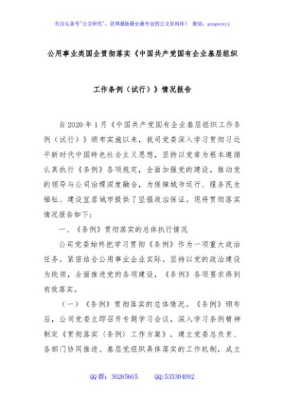 / 公用事业类国企贯彻落实《中国共产党国有企业基层组织工作条例(试行)》情况报告