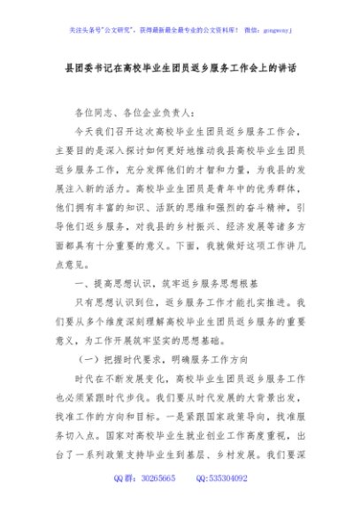 / 县团委书记在高校毕业生团员返乡服务工作会上的讲话