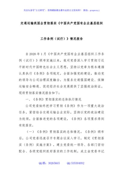 / 交通运输类国企贯彻落实《中国共产党国有企业基层组织工作条例(试行)》情况报告
