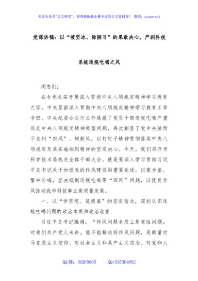 / 党课讲稿:以“破坚冰、除陋习”的果敢决心,严刹科技系统违规吃喝之风