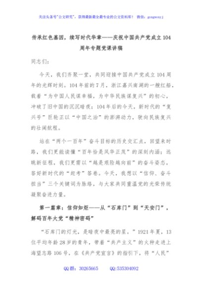 / 传承红色基因,续写时代华章——庆祝中国共产党成立104周年专题党课讲稿