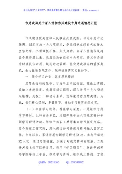 / 市财政局关于深入贯彻作风建设专题进展情况汇报