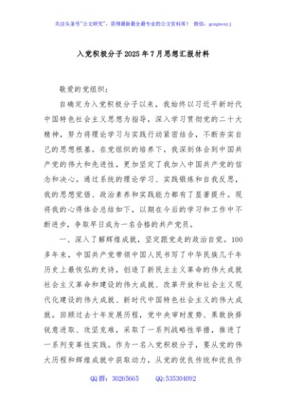 / 入党积极分子2025年7月思想汇报材料