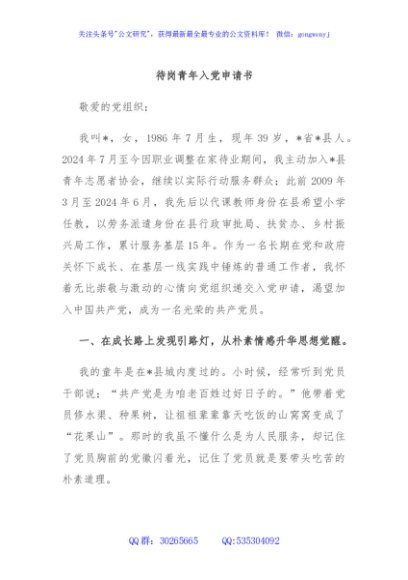 / 待岗青年入党申请书