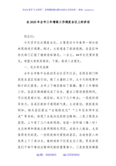 / 在2025年全市三年增绿工作调度会议上的讲话