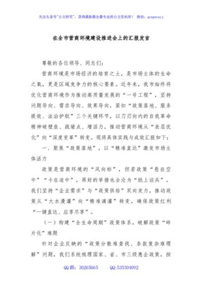 / 在全市营商环境建设推进会上的汇报发言