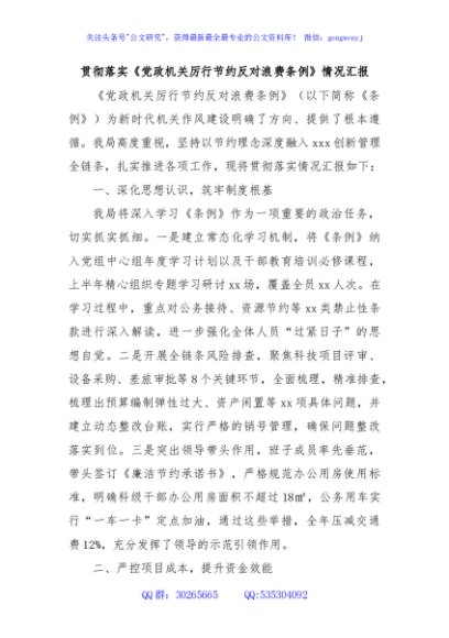 / 贯彻落实《党政机关厉行节约反对浪费条例》情况汇报