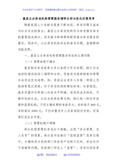 / 基层公办养老机构管理服务调研分析与优化对策思考