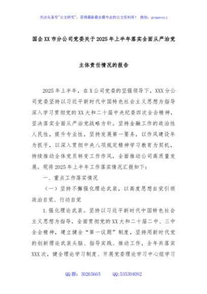 / 国企XX市分公司党委关于2025年上半年落实全面从严治党主体责任情况的报告