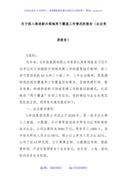 / 关于深入推进新兴领域两个覆盖工作情况的报告(企业党委报告)