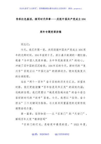 / 传承红色基因,续写时代华章——庆祝中国共产党成立104周年专题党课讲稿