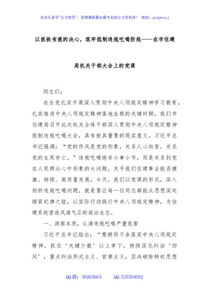 / 以抓铁有痕的决心,筑牢抵制违规吃喝防线——在市住建局机关干部大会上的党课