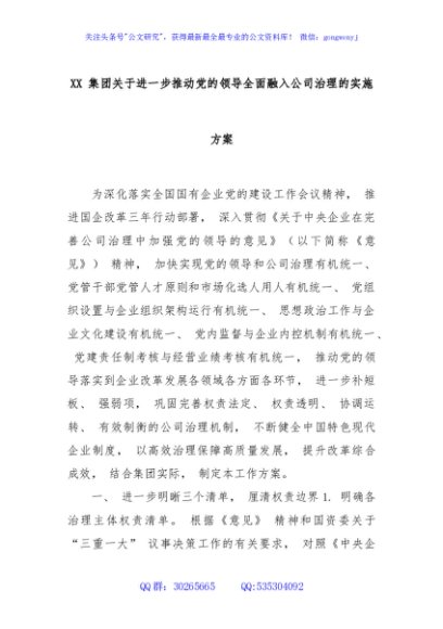 / XX 集团关于进一步推动党的领导全面融入公司治理的实施方案