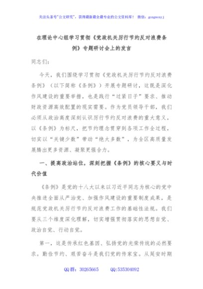 / 在理论中心组学习贯彻《党政机关厉行节约反对浪费条例》专题研讨会上的发言