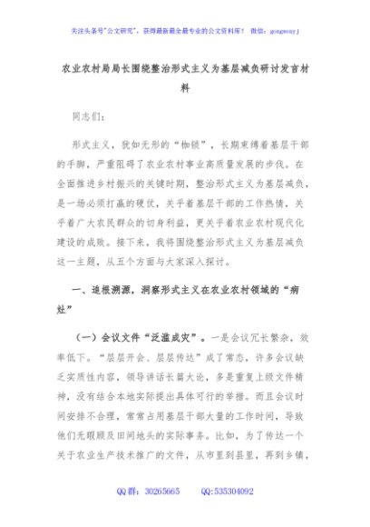 / 农业农村局局长围绕整治形式主义为基层减负研讨发言材料