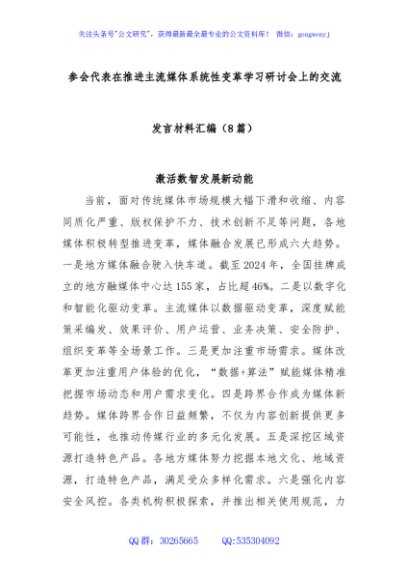 / (8篇)参会代表在推进主流媒体系统性变革学习研讨会上的交流发言材料汇编