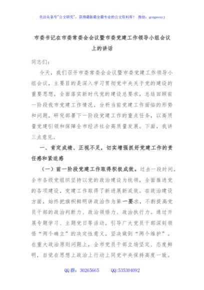/ 市委书记在市委常委会会议暨市委党建工作领导小组会议上的讲话