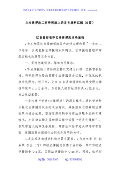 / (6篇)在法律援助工作培训班上的发言材料汇编