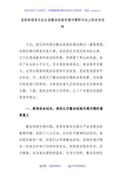 / 县财政局局长在全县整治违规吃喝问题研讨会上的发言材料
