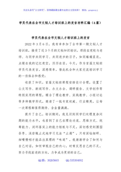 (4篇)学员代表在全市文秘人才培训班上的发言材料汇编